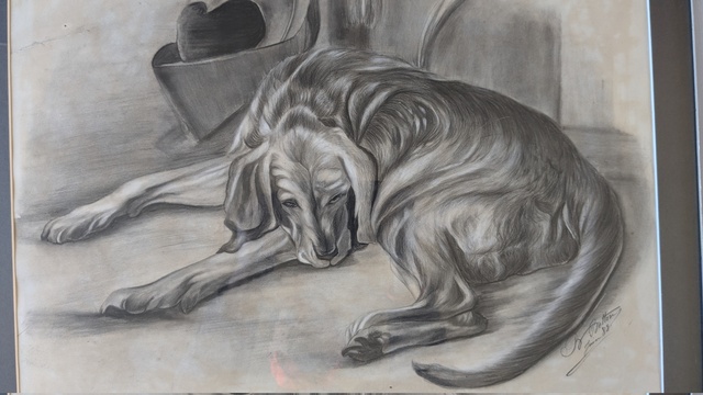 Dessin aux deux crayons de B.Betton d'aprés une gravure l'oeuvre de Sir Edwin Landseer "sleeping bloodhound". Réalisée en juin 88 d'après une peinture à l'huile vers 1860, elle même Reprise du tableau de Landseer conservé à la "Tate Britain" de Londres. 81.5 X 50.5 cm avec cadre.